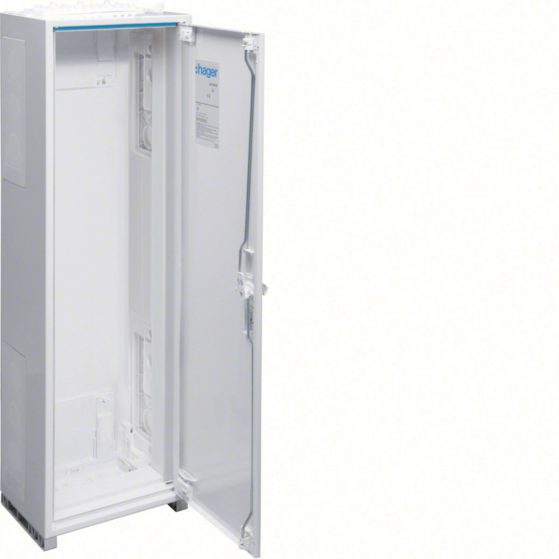 Wandaufbauschrank für die Innenraummontage mit VDE-Gutachten (Fertigungsüberwachung) nach DIN EN 61439-1/-3 und Maßnorm DIN 43870, zur Aufputz-, Unterputz- oder teilversenkter Montage. Zum Aufbau einer Niederspannungsverteilung bis 400 A, 3AC 230/400 V 50 Hz. Schutzart IP44, Schutzklasse II, Luft- und Kriechstrecken nach DIN VDE 0110-1/-2. Bestehend aus Schrank mit Tür aus pulverbeschichtetem, eingebranntem, stabil profiliertem 1 mm dickem Stahlblech, Innenauskleidung aus Kunststoff. Durchsteckflansche oben und unten je Feld eingebaut, rückseitige Vorprägung im Kunststoffteil und Sammelschienendurchführungen als beidseitige seitliche Vorprägung im unteren Bereich. Tür frontbündig mit innenliegenden, justierbaren Scharnieren, wahlweise rechts oder links anschlagbar mit 110 Grad Öffnungswinkel. Tür mit Vorreiber, ab Breite 800 mm und bei allen Schränken ab einer Höhe von 1250 mm mit Stangenverschluß mit Dreipunktschließung.