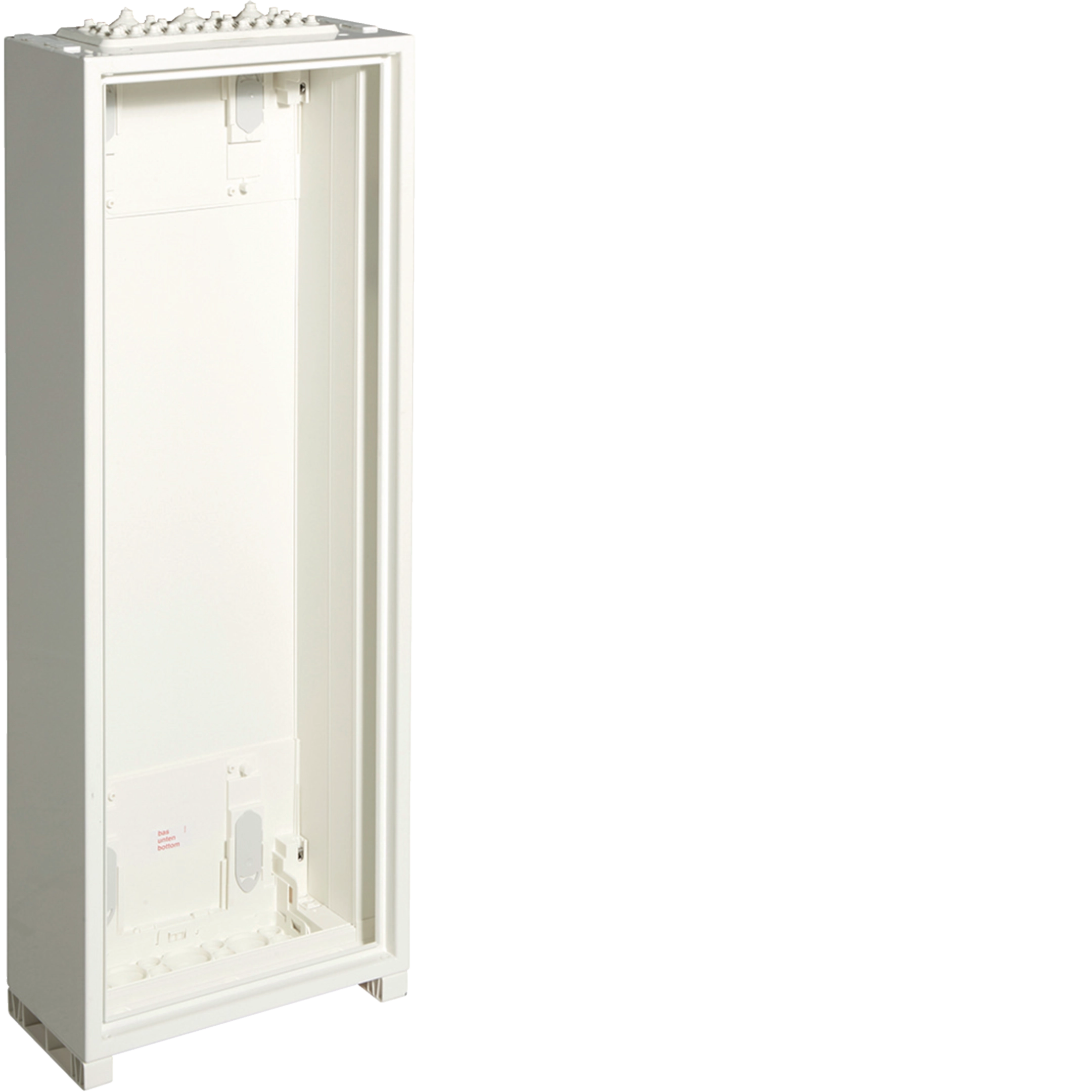 Feldverteiler AP zertifiziert nach EN 61439-1/-3, als Leergehäuse mit der innovativen Quickset - Technologie zur Einmann-Montage. Leerverteiler ohne Tür zur Aufnahme von Einbausätzen bestückt mit profilierten Tragschienen für den schnellen „Klick-Klack-Einbau“, Leitungseinführungen oben und unten durch herausnehmbare flexiblen Kunststoffflanschplatten, zusätzlich austauschbar.