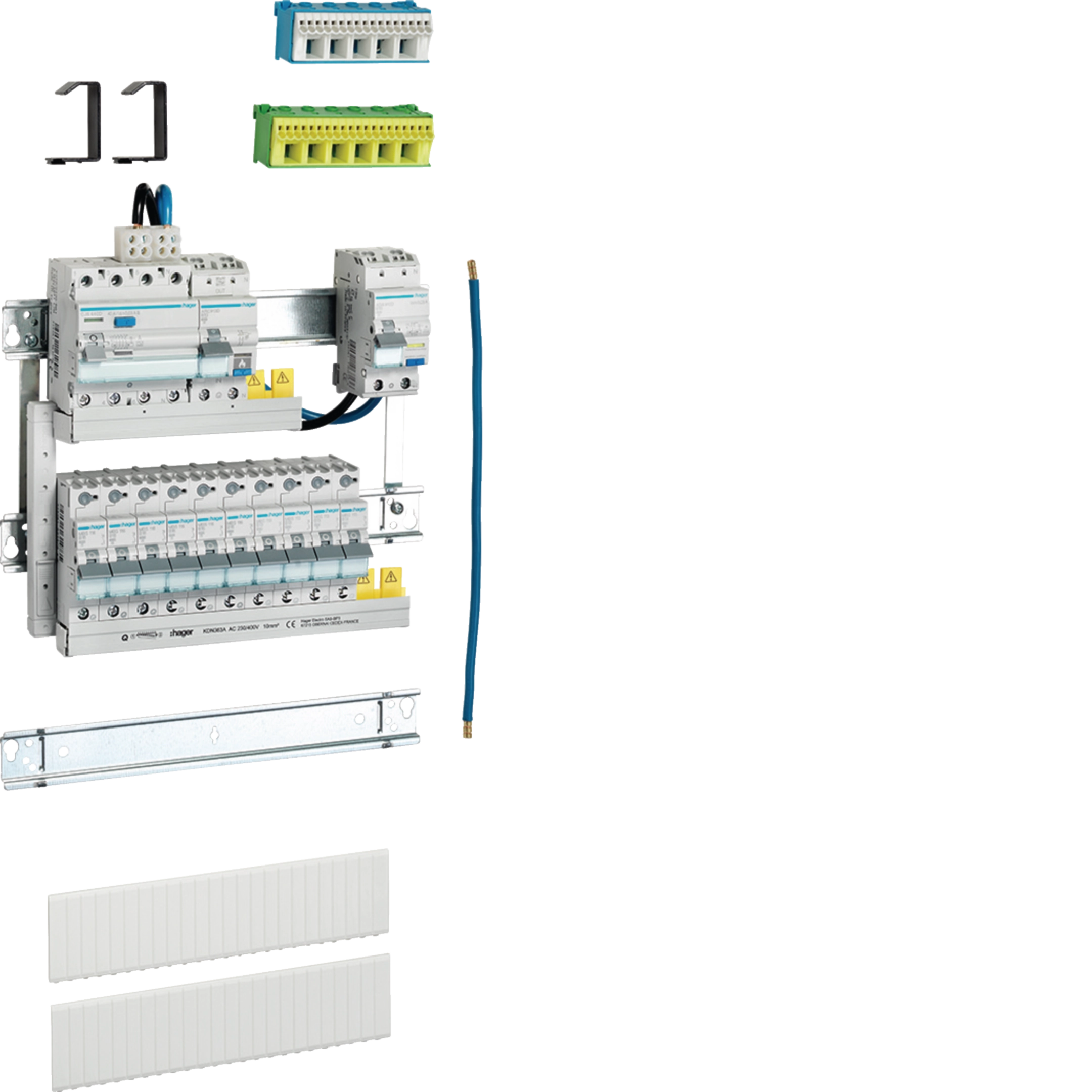 Quick Connect Verteilerausbaupaket zur Montage in bereits installierten Mauerwannen der Kleinverteilerserie Volta. Die bestückten und verschienten und vorverdrahteten Geräteträger brauchen dabei nur in die in den Mauerwannen vorhandenen Schrauben gehangen und befestigt werden. Zu Vervollständigung liegt für die 3-reihige Ausführung eine extra Hutschiene bei. Eine PE und eine N Klemme, 2 Drahthalteklammern und die Blindstreifen S35S runden das Paket ab.1.Reihe: CJG440D, ADS913D; 2.Reihe: 6 x MBS116, 4 x MBS113, Verschienung mit Reserve für weitere 2 x LS 1-polig. Alle LS-Schalter sind Eingangs- als auch Abgangsseitig mit den montagfreundlichen Quick Connect Klemmen ausgestattet.