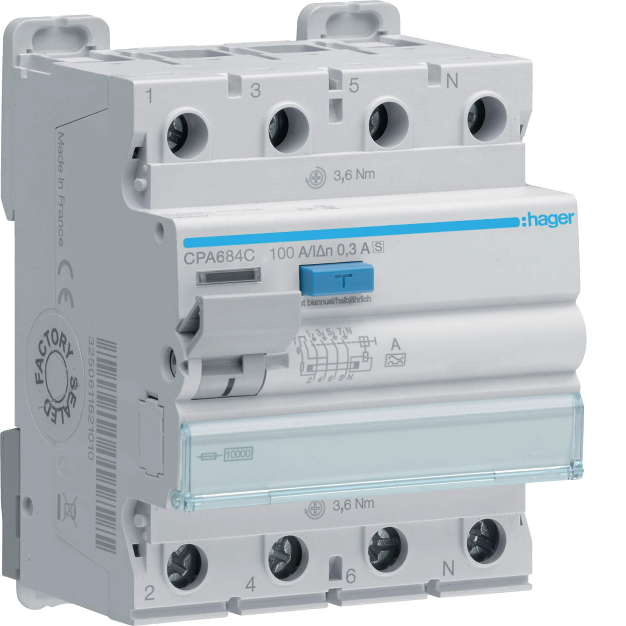 Fehlerstrom-Schutzschalter Hager RCCB (RCD) 4P 400V 0.3A Typ A S 100A 10kA 4TE CPA684C