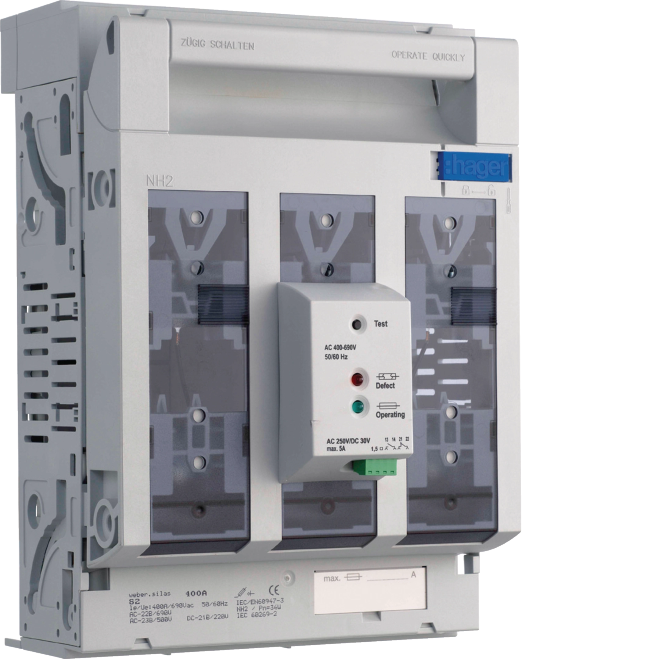 NHS-Lasttrenner weber.silas DIN2 690VAC 400A Aufbau/Profile oben/unten Überwach. S2SU