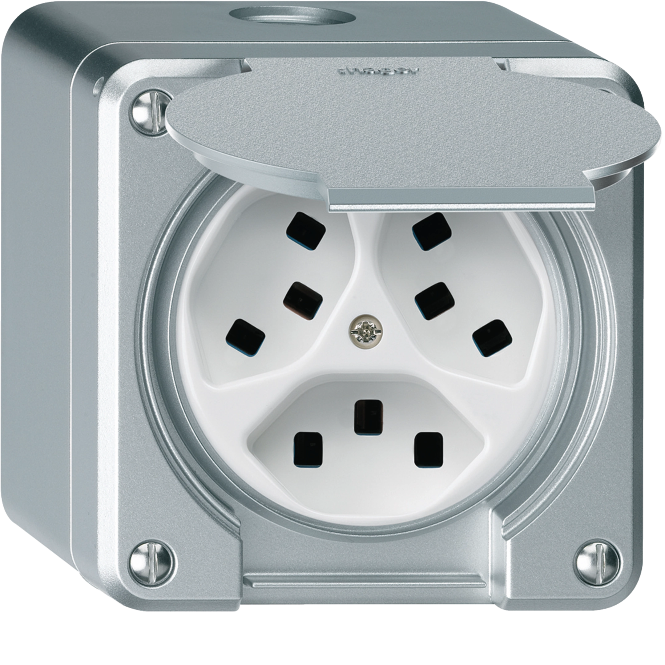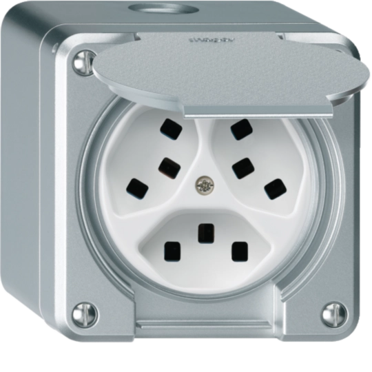 AP-Steckdose Hager robusto, 3×T23, mit Klappdeckel Q, aluminium WH36645349Q