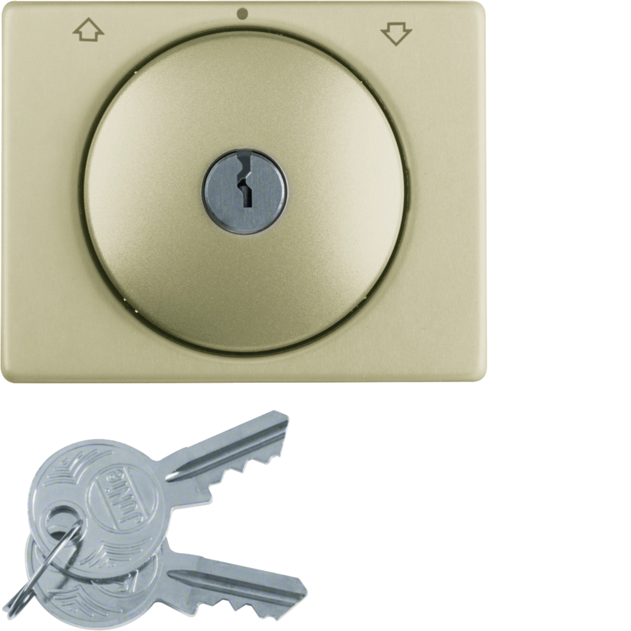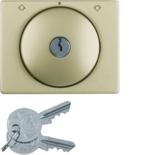 Zentralstück mit Schloss für Jalousie-Schlüsselschalter, mit Aufdruck, mit 2 Schlüsseln, Schlüssel in Mittelstellung abziehbar, mit Tastrastfunktion, Ersatzschlüssel und andere Schließungen auf Anfrage. Unterputz-Installation, Flächenprogramm. Material: Kunststoff, Thermoplast, Aluminium ummantelt, halogenfrei.