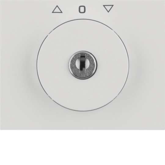 Zentralstück mit Schloss für Jalousie-Schlüsselschalter, mit Aufdruck, mit 2 Schlüsseln, Schlüssel in Mittelstellung abziehbar, mit Tastrastfunktion, Ersatzschlüssel und andere Schließungen auf Anfrage. Unterputz-Installation, Flächenprogramm. Material: Kunststoff, Thermoplast, bruchsicher, hochglänzende Oberfläche, halogenfrei.