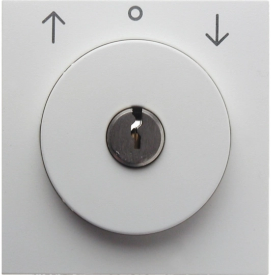 Zentralstück mit Schloss für Jalousie-Schlüsselschalter, mit Aufdruck, nur Tasterfunktion, mit 2 Schlüsseln, Schlüssel in Mittelstellung abziehbar, mit Tastrastfunktion, Ersatzschlüssel und andere Schließungen auf Anfrage. Unterputz-Installation, Standard-/Flächen-/Designprogramm. Material: Kunststoff, Duroplast, halogenfrei.