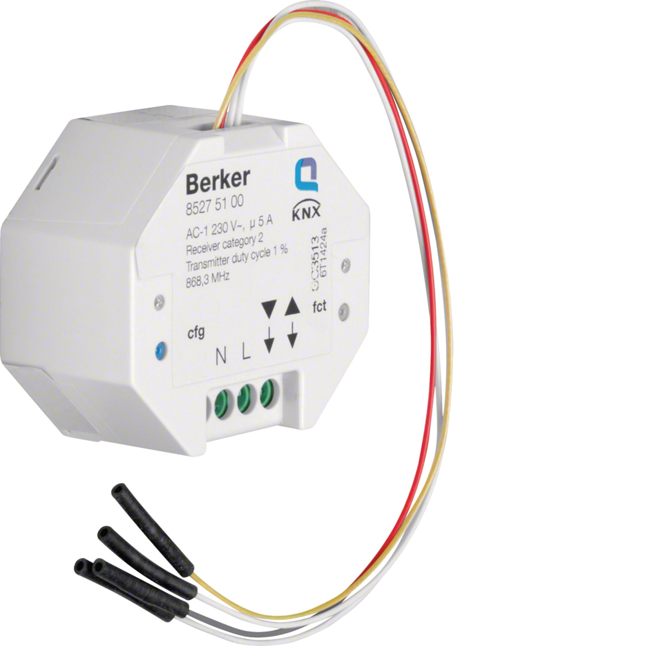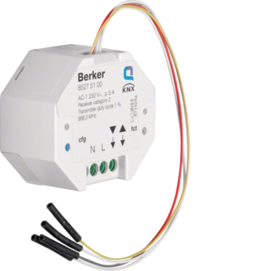 KNX-Funk Jalousieaktor 1-fach/Binäreingang 2-fach UP zur Ansteuerung eines Jalousiekanals über Funksignale und Einbindung von 2 potenzialfreien Kontakten zur Steuerung von Funkempfängern. Mit niedrigem Eigenenergiebedarf, Resetfunktion (auf Werkseinstellung), werkzeuglose quicklink-Konfiguration über Tasten und LED-Anzeige, quicklink Funktionen: Jalousie, 2 Szenen, Zwangssteuerung, Auf/Ab-Taster, Integration via KNX-Funk/TP Gateway AP ins KNX-TP-System, ETS Zusatz-Funktionen: +6 Szenen, Betriebsart, 1 Tastensteuerung, Auf/Ab, 2 x Alarm, Zustandsanzeige, ETS Zusatz-Funktionen: Repeaterfunktion, mit Konfigurations- und Funktions-LED, mit Kontroll-LED (Relais geschlossen), mit Konfigurations- und Funktions-Taste, Aufrufen der Szenen über KNX-Funk Geräte, Speicherung von Szenen sperrbar, mit 2 mechanisch und elektronisch gegeneinander verriegelten Relaiskontakten, Eingänge frei konfigurierbar, Ansteuerung durch z.B. Schalter, Taster, Zeitschaltuhr, Jalousieschaltuhr, Magnetkontakt. Für den Einbau hinter UP-Einsätzen, zum Anschluss an max. 2 potenzialfreien Kontakten, mit Schraubklemmen.- Betriebsspannung 230 V~ - Frequenz 50 Hz - Schaltstrom 6 A / 230 V AC1 - Funk Sende-/Empfangsfrequenz 868,3 MHz - Funkprotokoll KNX-Funk - Transmitter duty cycle 1 % - Empfänger-Kategorie 2 - Anzahl Funk Kanäle 2 - Anzahl quicklink Verknüpfungen max. 20 Sender/Empfänger - Funk Sendeleistung < 10 mW - Funk Sendereichweite (Freifeld) max. 100 m - Funk-Sendereichweite (Gebäude) max. 30 m - Lamellenverstellung bei Signaldauer < 1 s - Umschaltzeit bei Richtungswechsel < 0,6 s - Betriebstemperatur +5 ... +45°C - Leiterquerschnitt 0,75 ... 2,5 mm² - Binär-Leitungslänge ˜ 20 cm - Binär-Leitungslänge verlängerbar max. 5 m - Abmessungen (Ø x H) 53 x 27 mm.