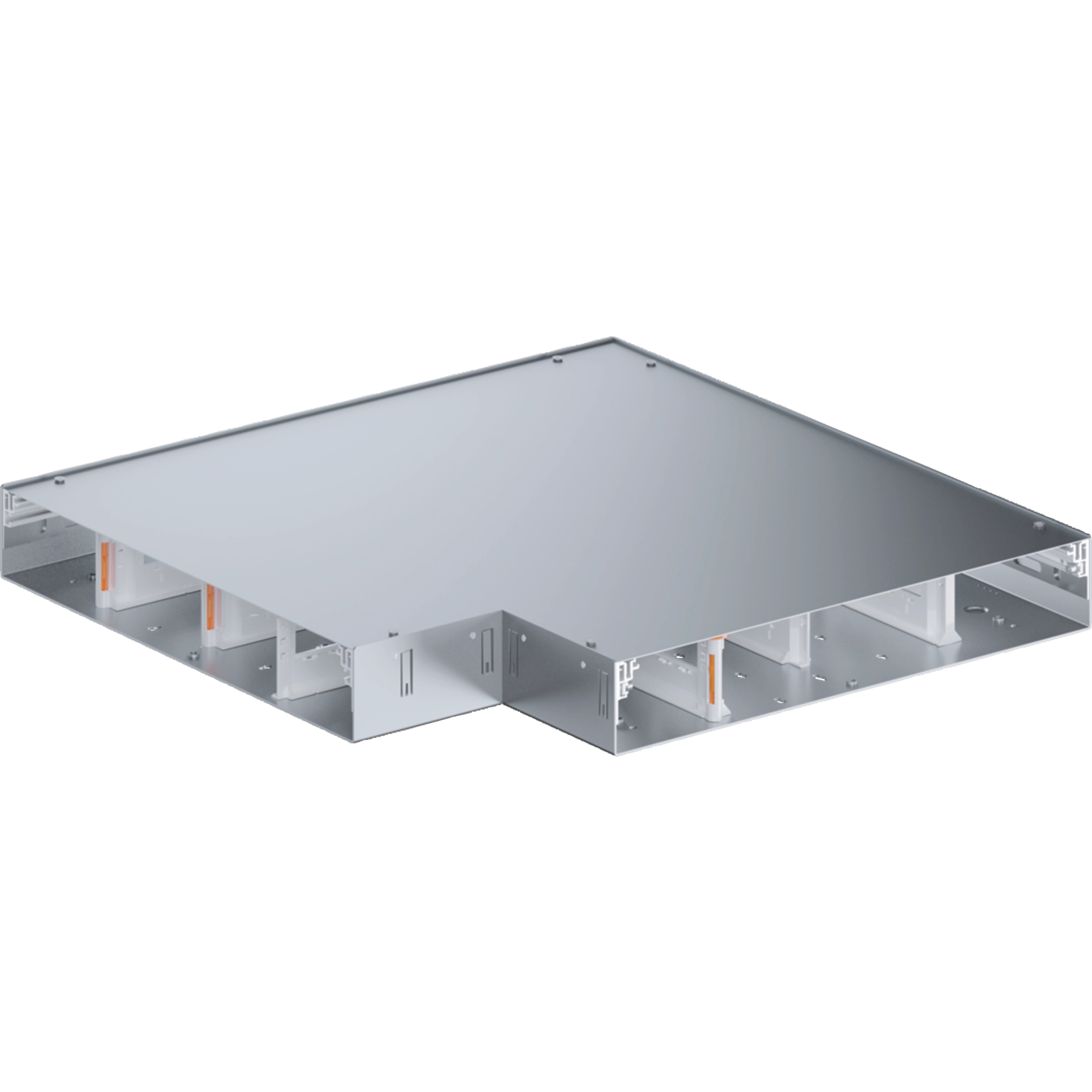 Flachwinkel-Unterteil zu Bodenkanal für trockene Räume im Innenbereich mit trockengepflegten Fußböden. Das Unterteil besteht aus einem Bodenwannenblech mit vormontierten Seitenprofilen und wird inklusive Geräteträgern, Kanalverbindern und Montageschutzabdeckung geliefert. Die vormontierten Bodenanschlagsprofile haben einen Verstellbereich zwischen 0 - 25 mm und entsprechen der möglichen aufzubringenden Bodenbelagsstärke. Geprüft nach DIN EN 50085-2-2.