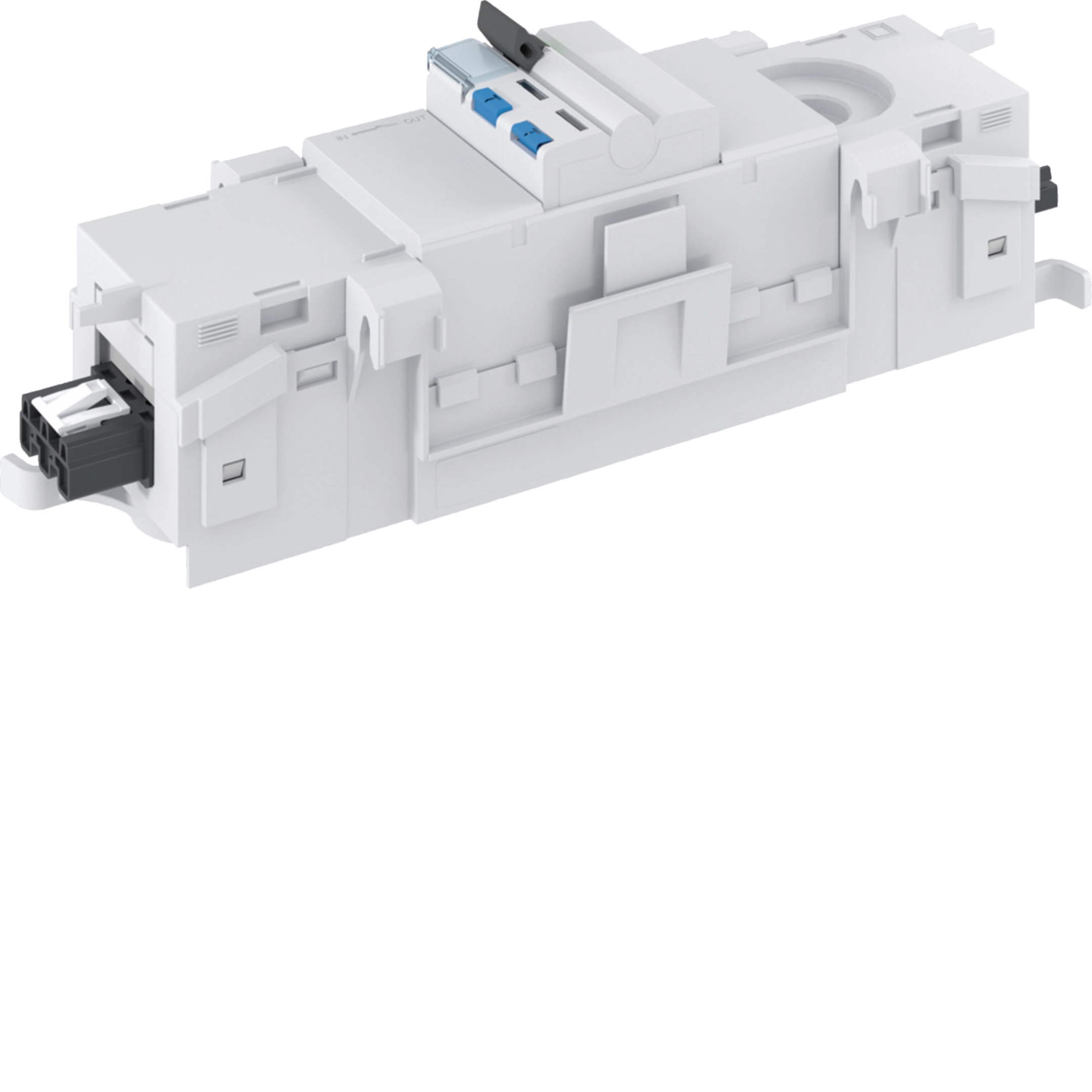 Kleinverteiler für Brüstungskanal mit frontrastender Gerätemontage, Schutzart IP2xC, 3 Platzeinheiten, modular anreihbar mit Steckdosen für Brüstungskanal.