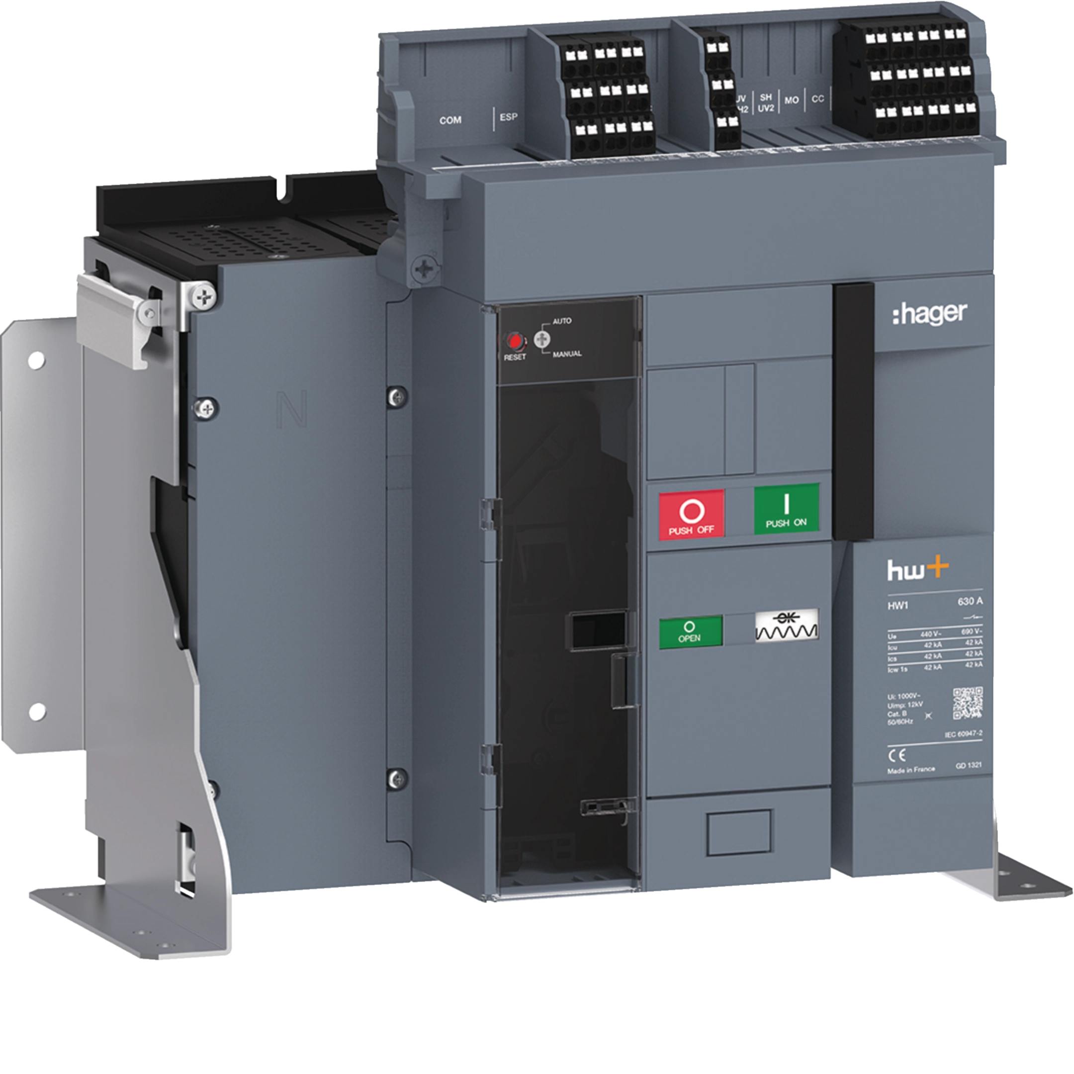 Offener Leistungsschalter hw+ für den Anlagenschutz nach DIN EN 60947-2 (DIN VDE 0660 Teil 101) zum Einbau und Schutz in Energieverteilungen, Ics=Icw=100% Icu für 42 kA und 55 kA.