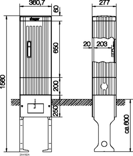 Kabelverteilersäule Baureihe 152, mit SaS 4xCu 30x6mm, 1560x360,7x277mm (HxBxT) ZAK152A