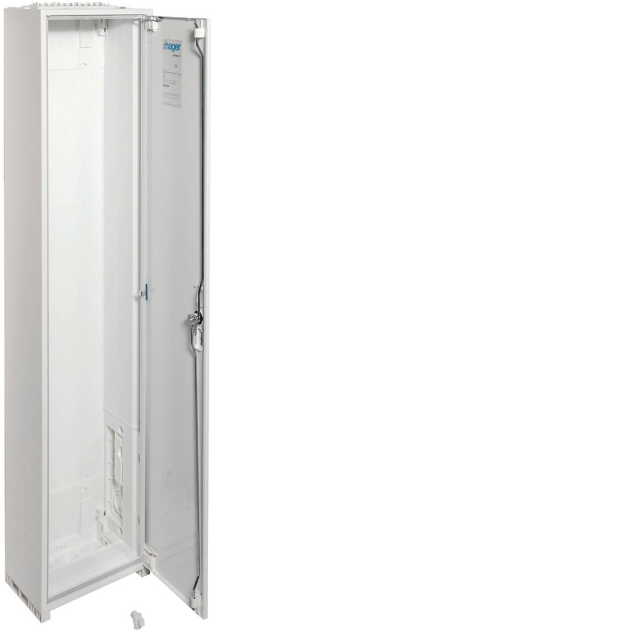 Tür frontbündig mit innenliegenden, justierbaren Scharnieren, wahlweise rechts oder links anschlagbar mit 110° Öffnungswinkel. Türverschluss mit Vorreiber, ab Breite 800 mm und bei allen Schränken ab einer Höhe von 1250 mm mit Stangenverschluss mit Dreipunktschließung. Türverschluss durch andere Schließungen austauschbar. Schrank nebeneinander und übereinander anflanschbar. Schrankgröße 1- bis 5-feldrig mit 72 bis 540 Platzeinheiten (PLE).