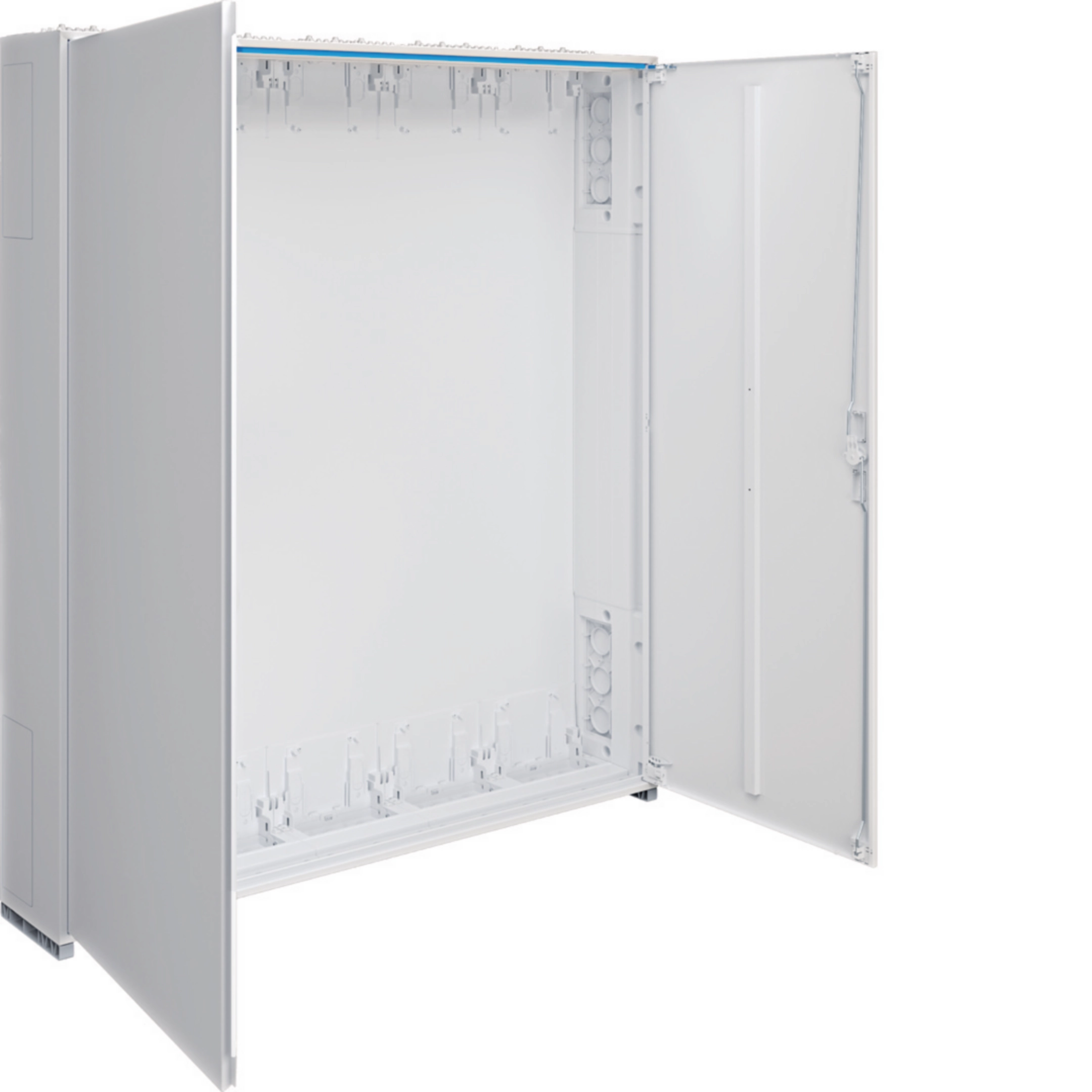 Tür frontbündig mit innenliegenden, justierbaren Scharnieren, wahlweise rechts oder links anschlagbar mit 110° Öffnungswinkel. Türverschluss mit Vorreiber, ab Breite 800 mm und bei allen Schränken ab einer Höhe von 1250 mm mit Stangenverschluss mit Dreipunktschließung. Türverschluss durch andere Schließungen austauschbar. Schrank nebeneinander und übereinander anflanschbar. Schrankgröße 1- bis 5-feldrig mit 72 bis 540 Platzeinheiten (PLE).