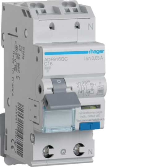 Disjoncteur différentiel Hager 1P+N 230V C 16A 30mA F 6kA 2 modules ADF916QC