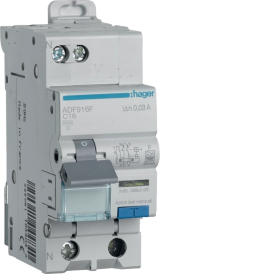 Disjoncteur différentiel 16A 1P+N 6kA Courbe C 30mA type F 2modules ADF916F