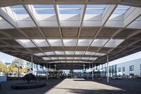 Mesurant 108 mètres sur 39, l'élément le plus frappant du bâtiment est le toit en saillie construit avec des poutres en bois stratifié, présentant une grille de 3 x 3 mètres et reposant sur seulement 18 supports minces. Le grand toit qui dépasse du bâtiment est conçu comme une invitation à attirer les gens à l'intérieur : "Il crée également un espace protégé des intempéries pour que les employés puissent se rencontrer et prendre un café après le déjeuner", explique l'architecte. Les architectes et Hager Group ont accordé une attention particulière aux qualités durables de la conception. Avec sa structure modulaire, le Hager Forum offre un haut degré de flexibilité, permettant des modifications futures et de nouvelles utilisations avec un minimum d'efforts et de dépenses. Les volumes compacts du bâtiment, son enveloppe parfaitement isolée et ses surfaces vitrées optimisées pour la lumière du jour, ainsi qu'une installation photovoltaïque sur le toit et un système de contrôle intelligent du bâtiment utilisant des produits de Hager Group, garantissent une efficacité énergétique et un confort excellents pour un coût technologique relativement modéré.