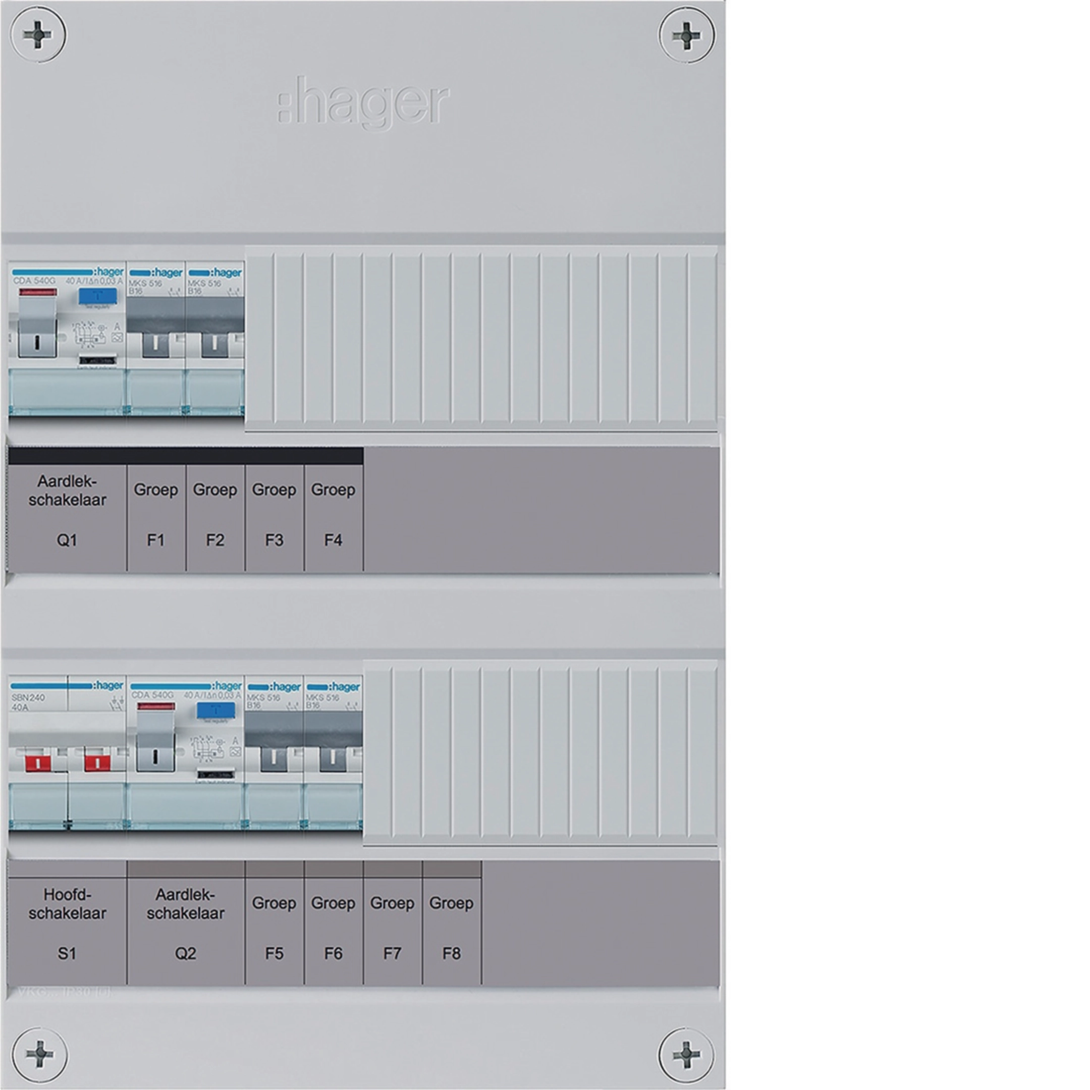 4-groepenverdeler HS, 2 x ALS 30 mA, 1-fase, excl. buisinvoer