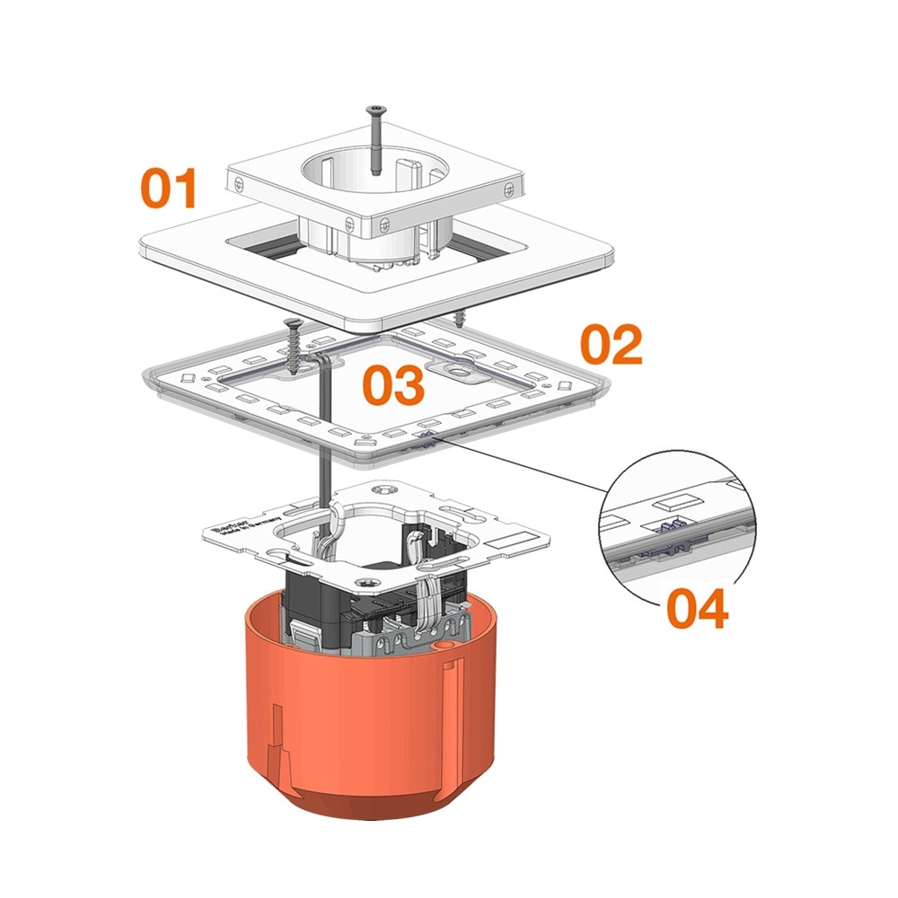 - Połączenie między modułem LED a mechanizmem gniazda lub łącznika odbywa się za pomocą otworu montażowego.