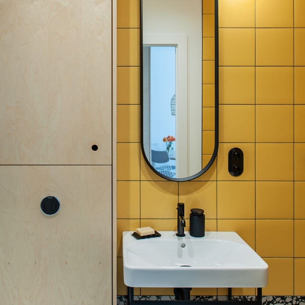 Berker Serie 1930, z charakterystycznymi, eleganckimi, okrągłymi formami, harmonijnie wkomponowała się w całość, nadając wnętrzu oryginalnego stylu. Precyzja wykonania i dbałość o szczegóły sprawiają, że osprzęt nie tylko zapewnia niezawodne działanie, ale stanowi również kluczowy element dekoracyjny, podkreślając estetykę i nowoczesność tego kameralnego apartamentu.