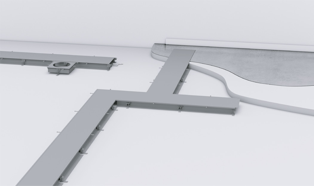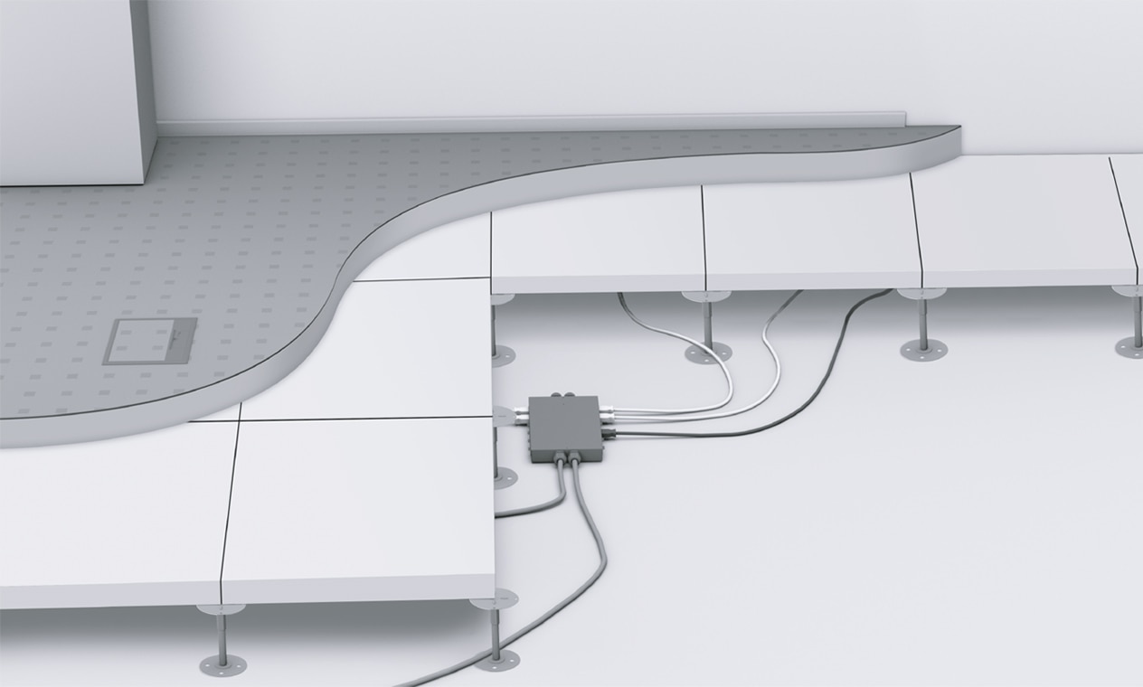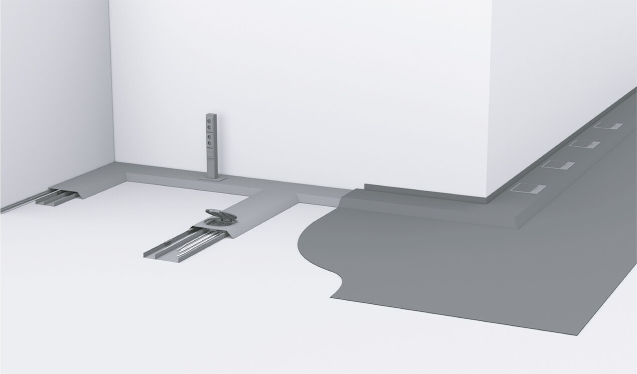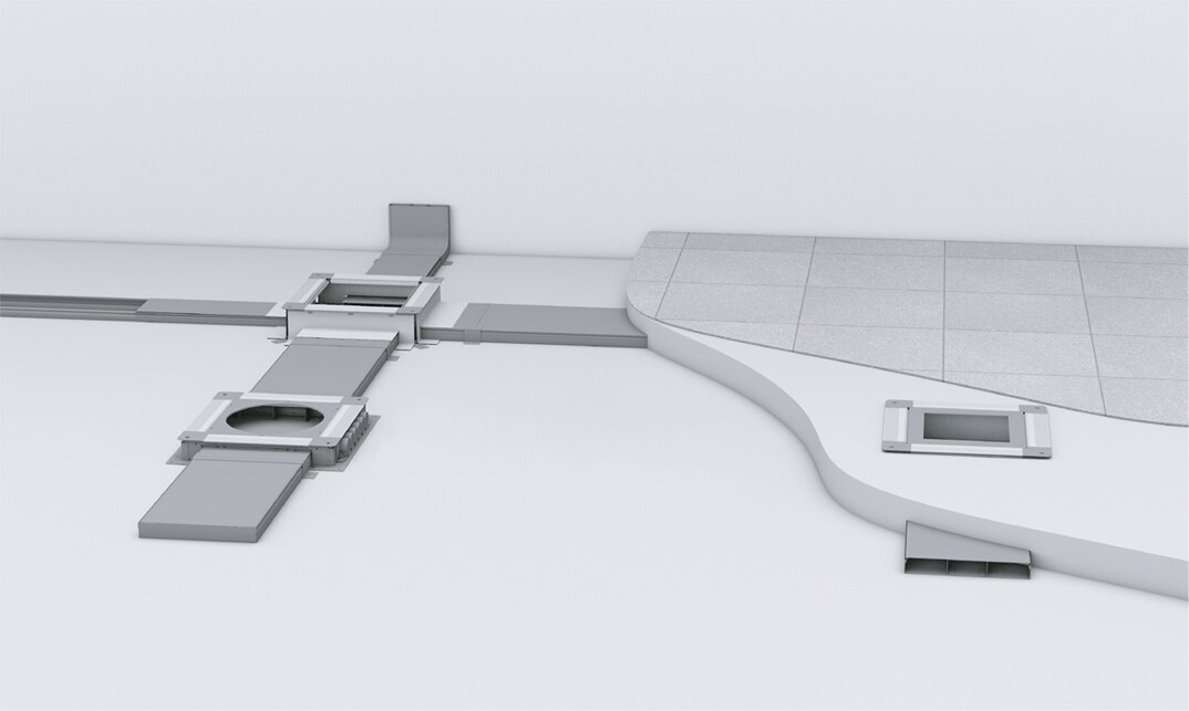 System kanałów tehalit.BK można prowadzić w dowolnym miejscu. To doskonałe rozwiązanie do pomieszczeń typu open space oraz w sytuacjach, kiedy nie ma jeszcze projektu aranżacji wnętrz. Kanały są otwierane na całej długości, można je dowolnie poziomować (na całej trasie), natomiast jastrychem oblane są tylko boki kanału.